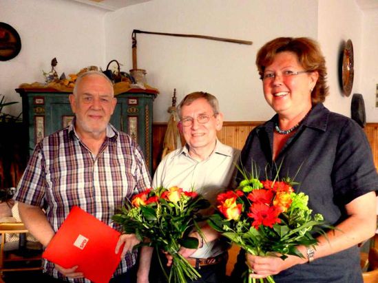Kerstin Binder, Vorsitzende des SPD-Ortsvereins und Aichwalder Gemeinderätin, konnte sich über den guten Besuch der Mitgliederversammlung im Gasthaus „Linde“ in Aichschieß freuen. Der Rahmen war daher auch passend für zwei Ehrungen: Binder gratulierte Frieder Gadesmann und Helmut Roth zu vierzig Jahren Mitgliedschaft in der SPD und überreichte Präsente des Ortsvereins.